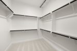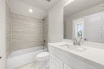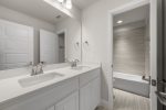 - Quartz vanity tops in master and secondary baths with rectangular white sinks, 4″ backsplash and two-handle faucet in Stainless finish