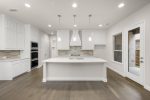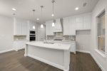 - Island kitchen with custom-built cabinetry – painted or stained – with 42″ uppers, 2nd row of cabinets, quartz countertops, upgraded kitchen backsplash, pot and pan drawers below cooktop, tile backsplash, pendant lights and walk-in pantry