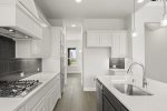 - Upgraded stainless appliance package includes a 5-burner gas cooktop, built-in double oven/microwave, vent hood blower vented to outside and upgraded dishwasher