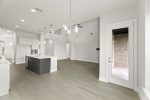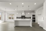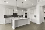 - Island kitchen with custom-built custom-painted cabinetry with 42″ upper cabinets, quartz tops, upgraded tile backsplash, undercounter lights, pot and pan drawers below cooktop, trash drawer pullout, 3 pendant lights, and walk-in pantry
