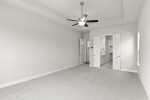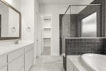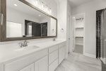 - Master en suite bath includes a drop in tub with cabinet skirt, ceramic tile surrounds and deck mount faucet, separate shower with seat and ceramic tile surrounds, Quartz vanity tops with 2 rectangular white sinks, decorative framed mirror, window with rainglass, commode cabinets. Large walk-in closet