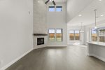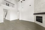 - Family room with corner 36″ direct vent sealed gas fireplace with gas logs, glass doors and red oak box mantle with tile surrounds from mantle to ceiling