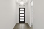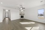- Family room with corner Newport 36″ direct vent sealed gas fireplace with gas logs, glass doors and red oak box mantle