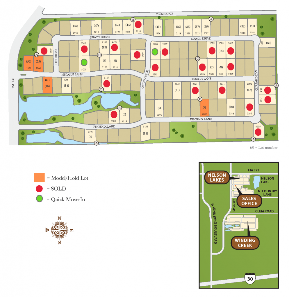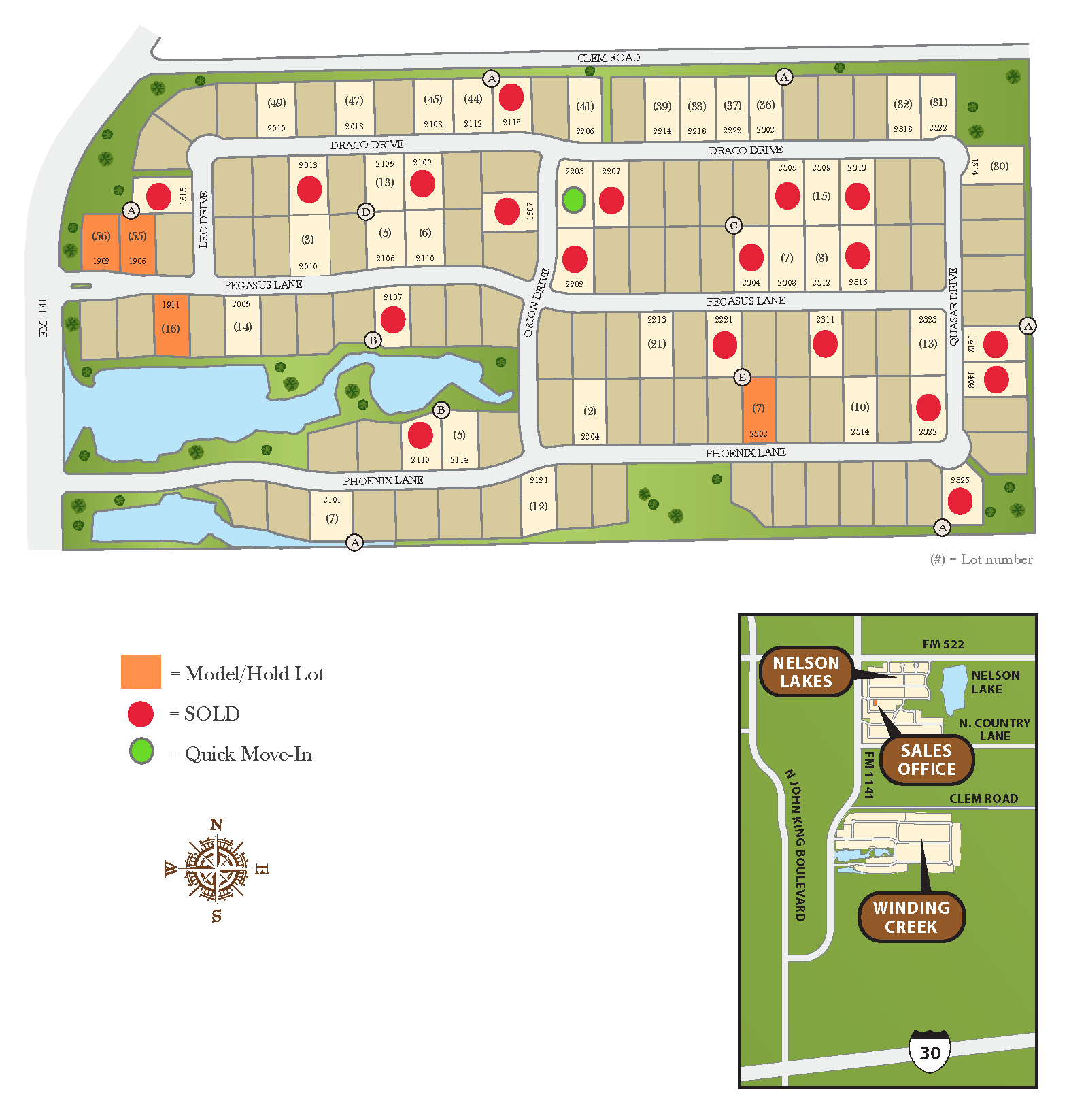To visit the Nelson Lake sales office: head northeast on I-30 E, take exit 69 toward John King Blvd, merge onto I-30 Frontage Rd, turn left onto John King Blvd, turn right onto FM1141, turn right onto Euclid Dr. 2005 Euclid will be on the right.
